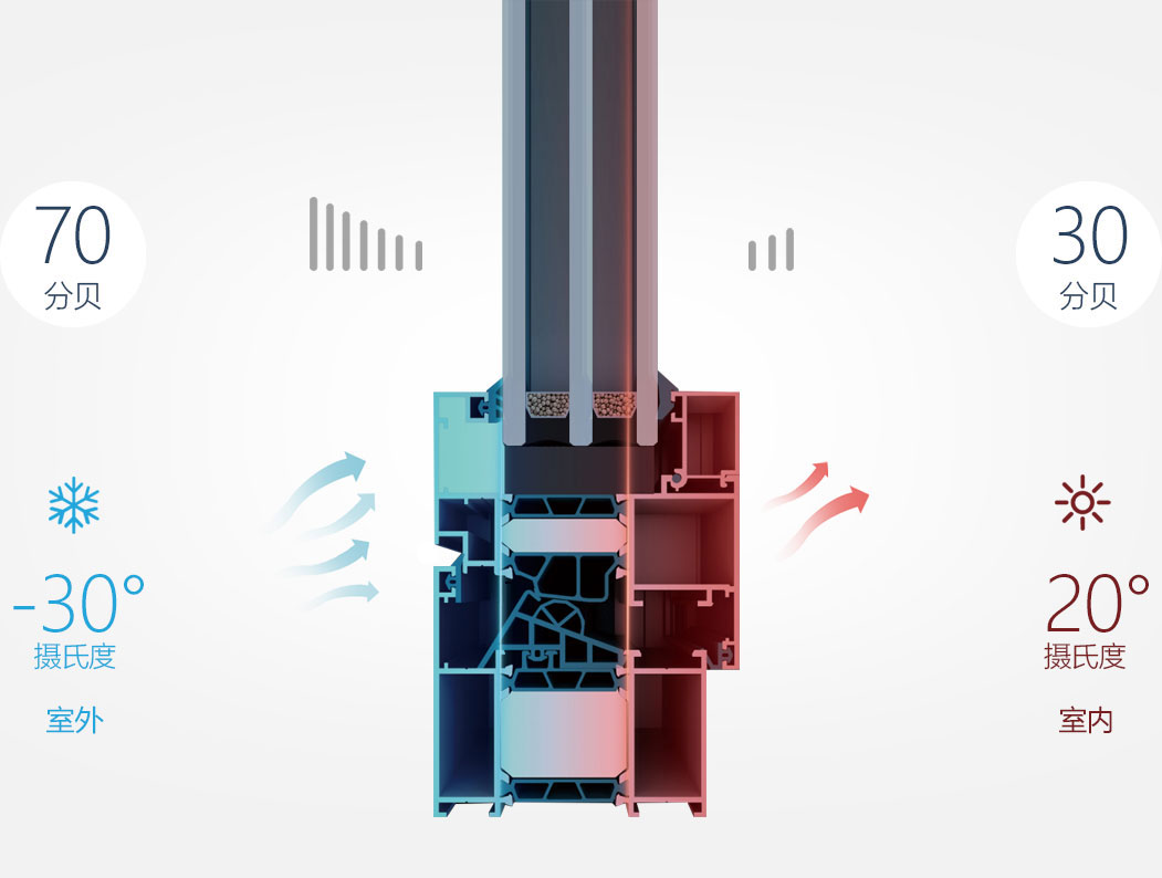 所有PA66尼龍隔熱條均設計在同一垂直線上,確保同一條等溫線,讓產品的隔音、保溫性能更出眾,配合四道密封工藝,更好地解決了對室內的保溫隔熱的問題